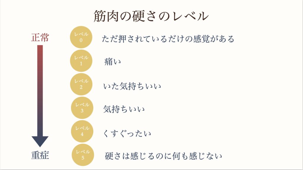 - レベル5:硬いのに何も感じない → 重度の筋肉ロック